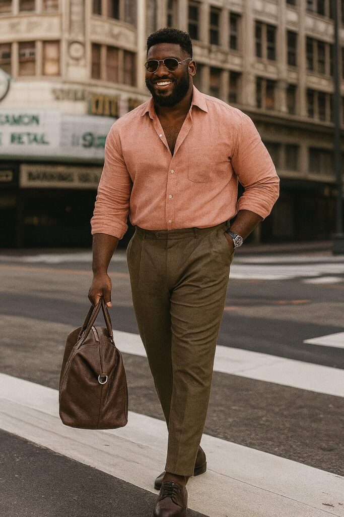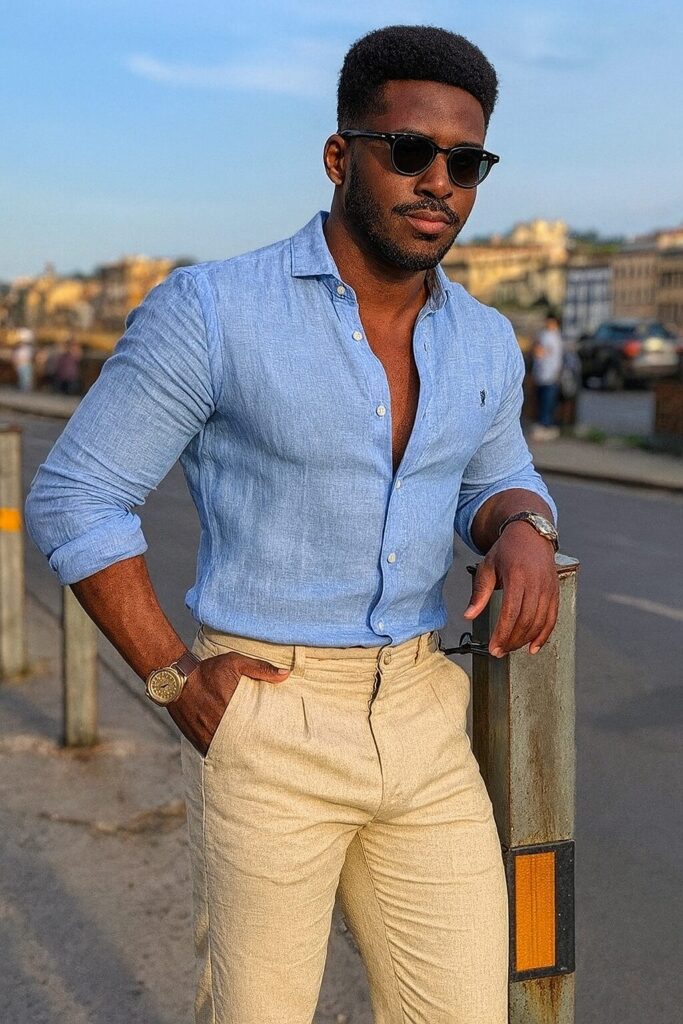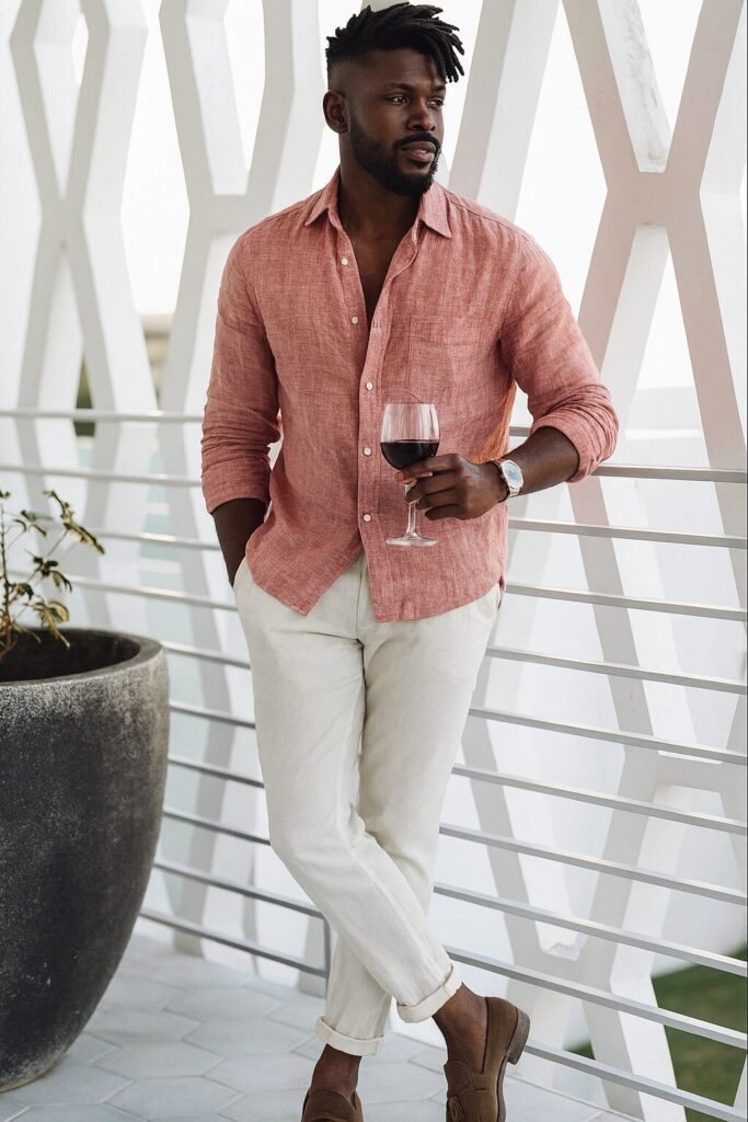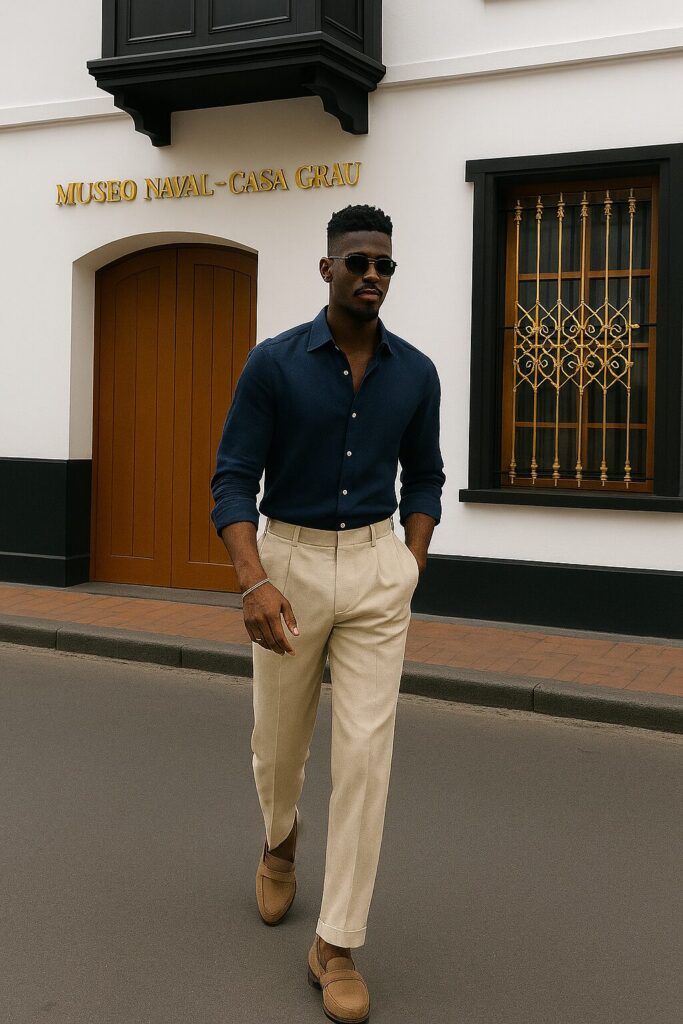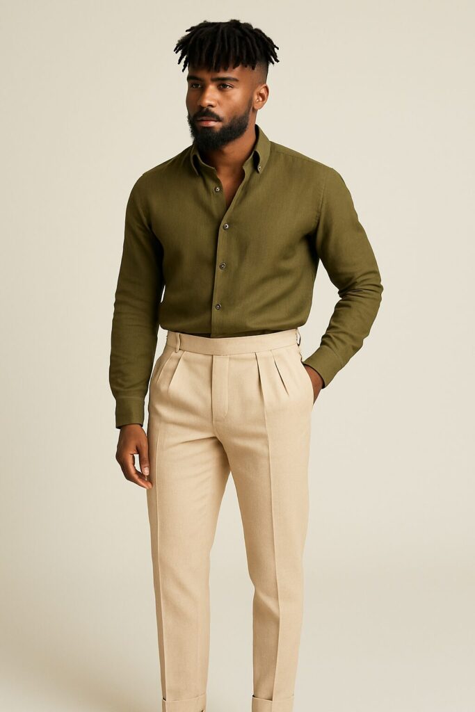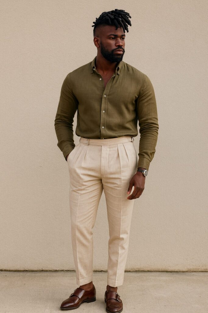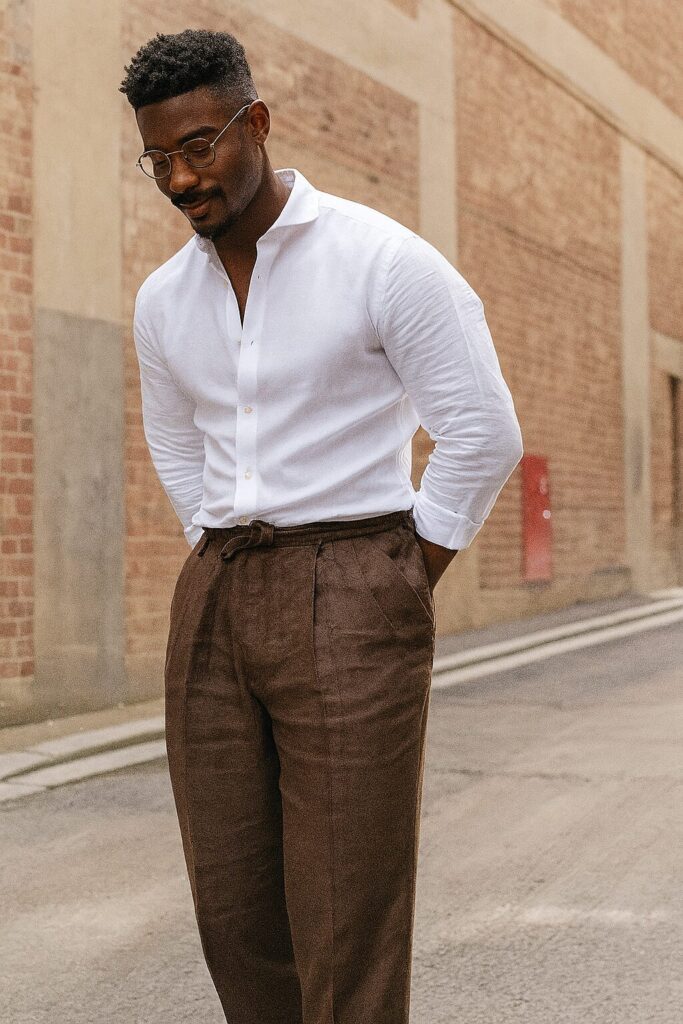 - Calça de alfaiataria + camisa de linho: escolha cores complementares (como bege e branco, marrom e vinho, azul-marinho e areia) para um look equilibrado.