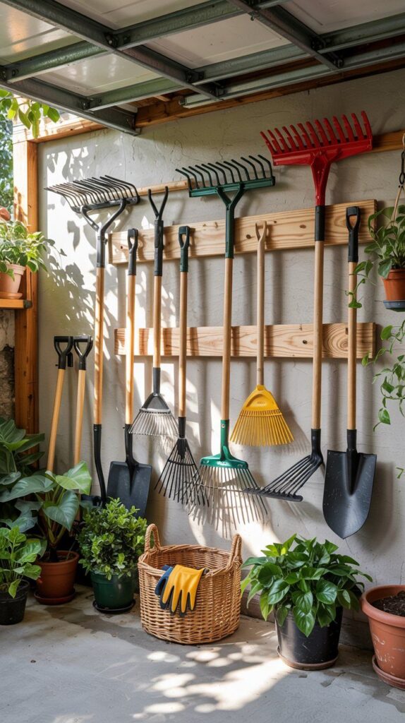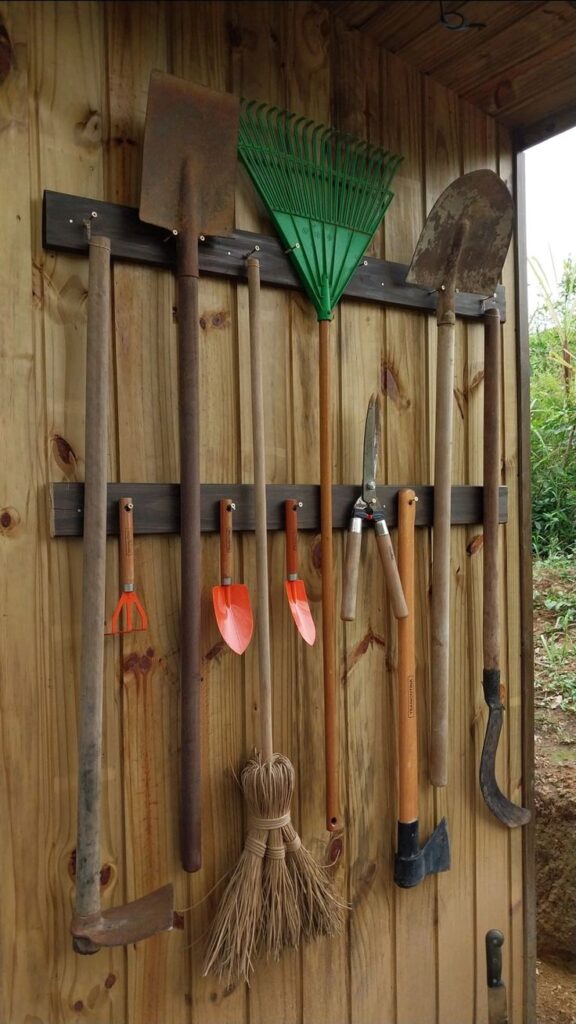 Ferramentas longas (enxadas, pás, ancinhos) devem ficar na vertical, suspensas, para liberar o chão e evitar acidentes.