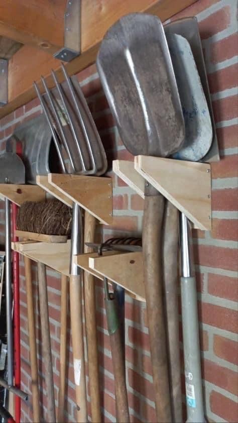 - Ganchos simples para cabos de enxada, pá e rastelo
